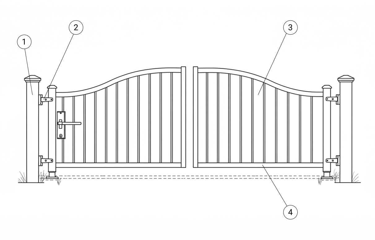 Изделия создают из каркаса, столбов, и наполняют створки заказанным заказчиком материалом. Каркас создан из трубы прямоугольной или квадратной. Для столбов подходит профиль 100х100 мм или 80х80 мм.
